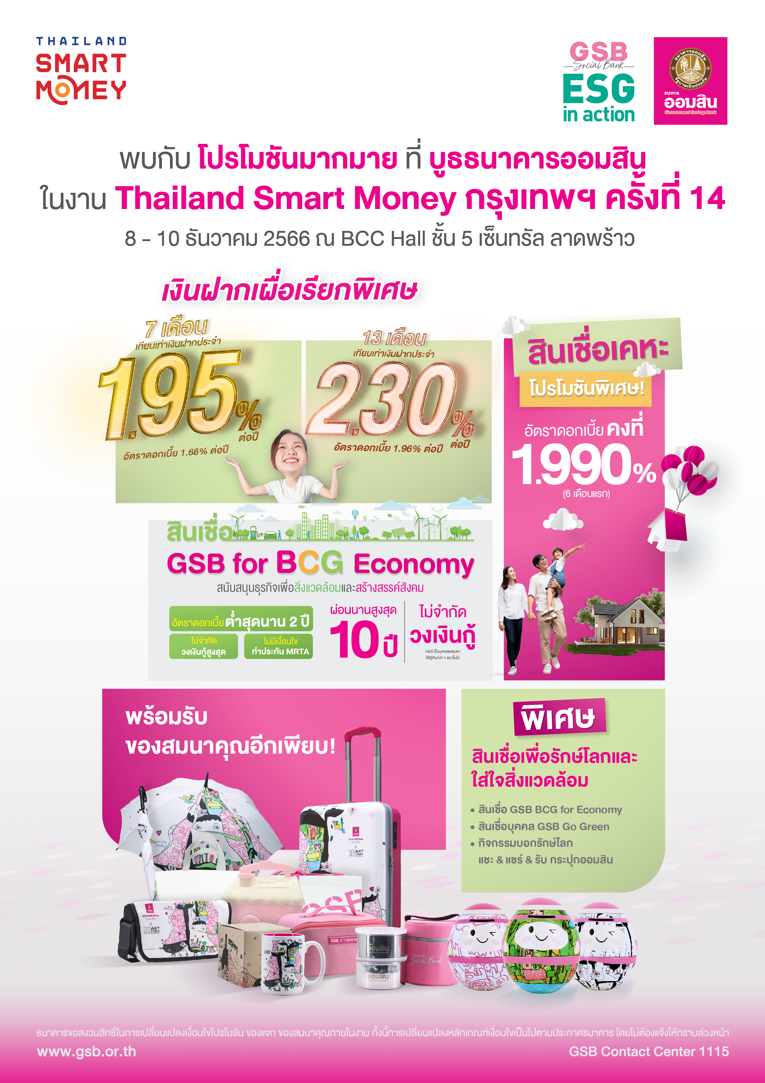 งาน Thailand Smart Money กรุงเทพฯ ครั้งนี้ ธนาคารออมสินเข้าร่วมภายใต้แนวคิด “GSB Journey to The Green Frontier : บนเส้นทางสู่โลกการเงินสีเขียว” สอดคล้องยุทธศาสตร์ธนาคารเพื่อสังคมที่มุ่งเน้นดำเนินการตามกรอบ ESG in action สู่การพัฒนาที่ยั่งยืน โดยให้ความสำคัญตั้งแต่กระบวนการจัดทำบูธที่เลือกใช้วัสดุที่เป็นมิตรต่อสิ่งแวดล้อม การออกแบบผลิตภัณฑ์และบริการที่เน้นสร้างผลกระทบเชิงบวกต่อสังคม แล้วพบกันที่งาน Thailand Smart Money ณ เซ็นทรัล ลาดพร้าว ระหว่างวันที่ 8-10 ธ.ค. 2566.