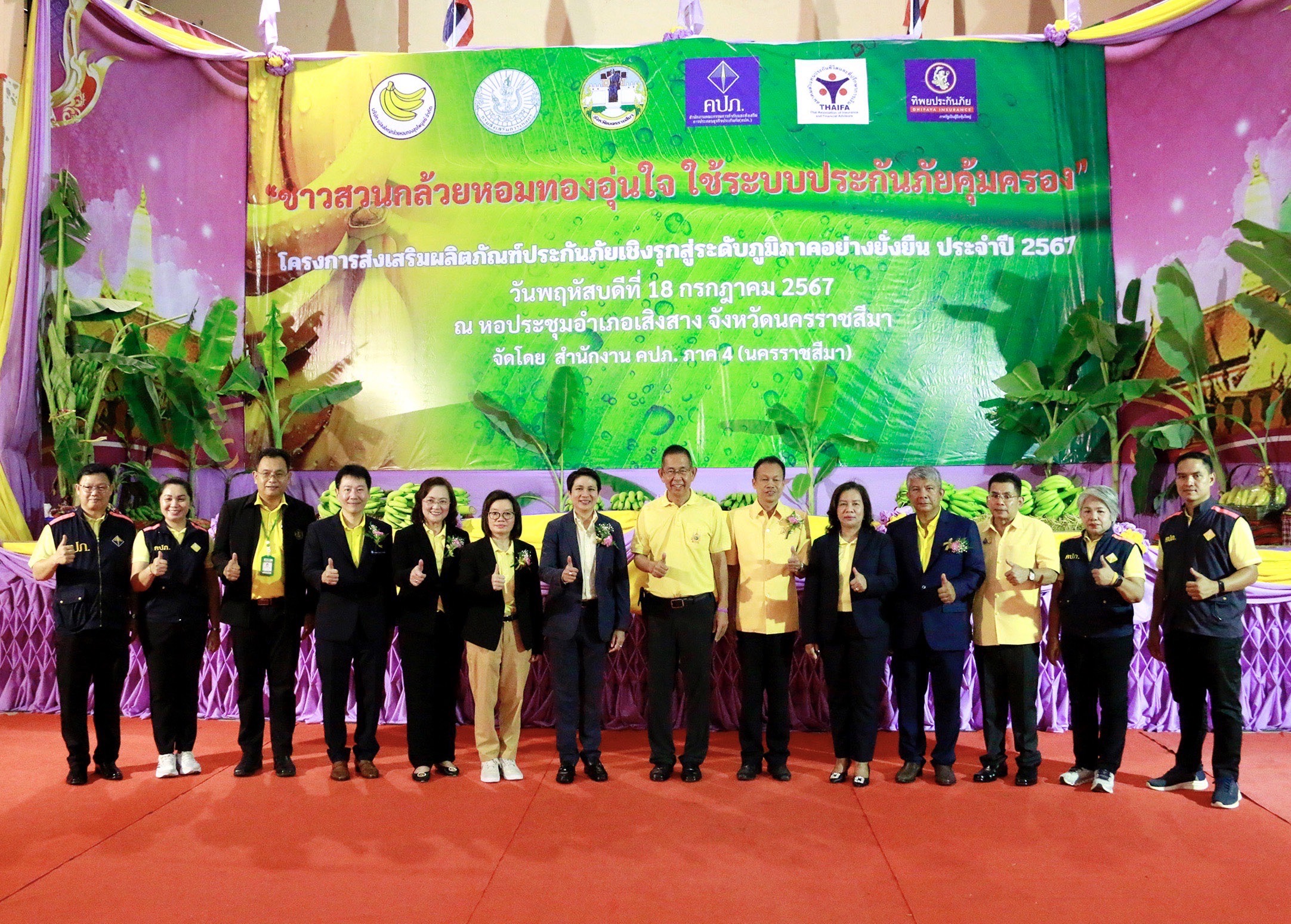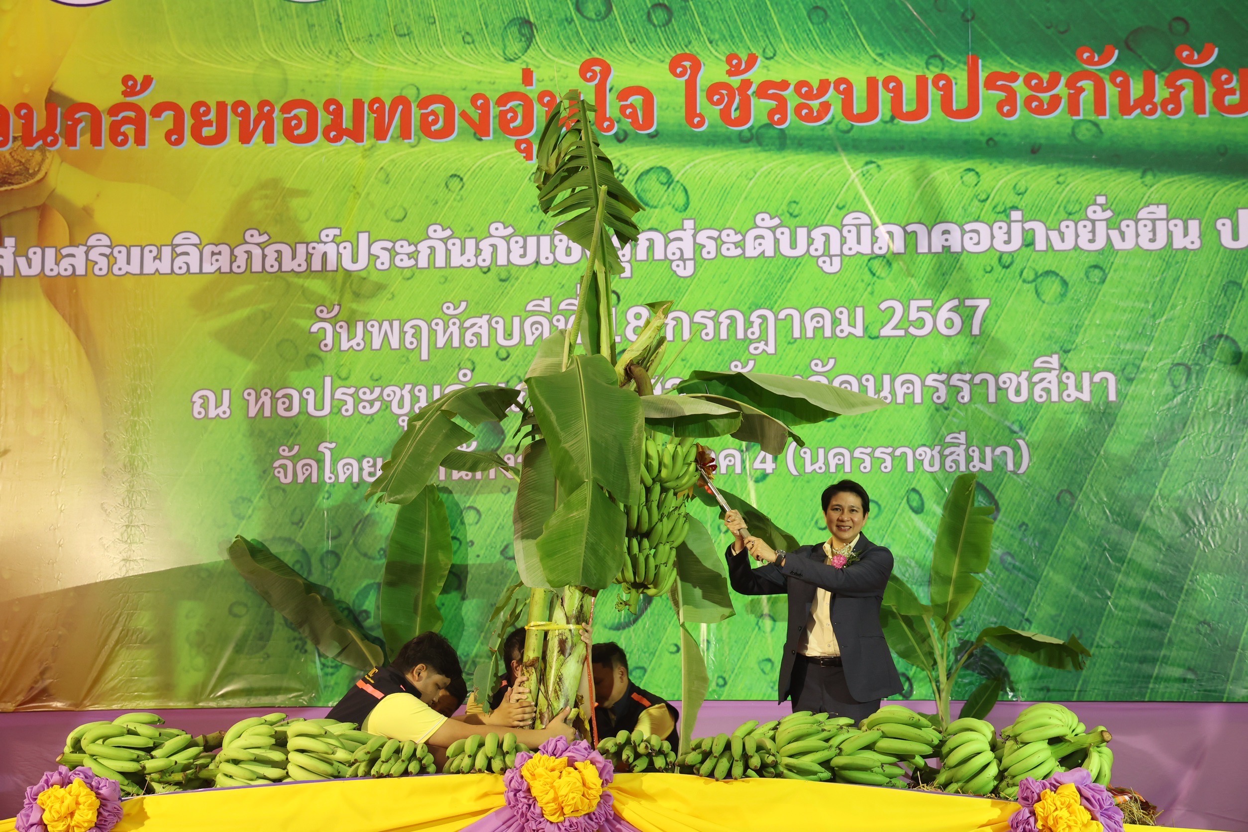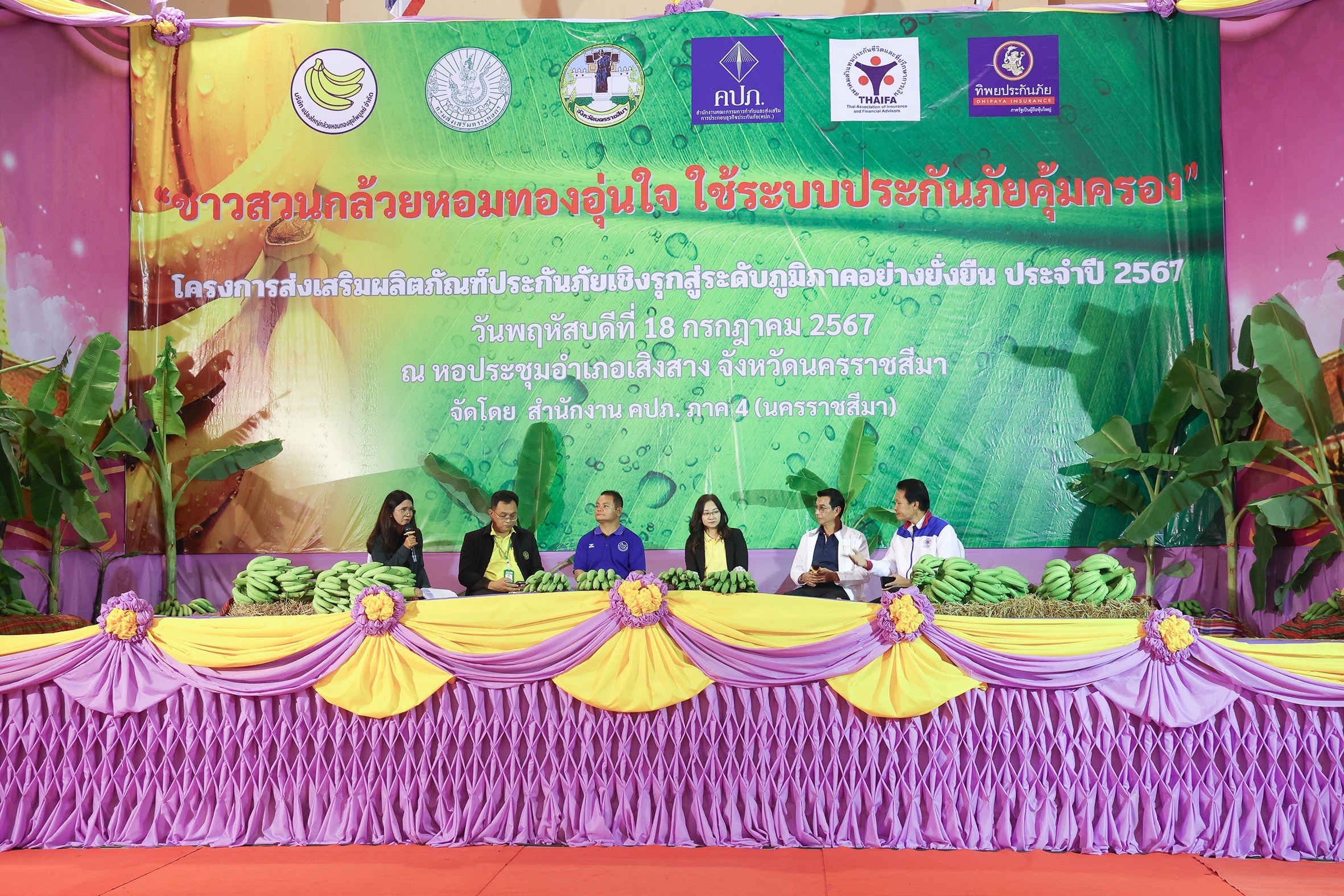 ดังนั้น ในปี 2567 จึงได้ลงพื้นที่อำเภอเสิงสาง จังหวัดนครราชสีมา เพื่อสำรวจแหล่งเพาะปลูกกล้วยหอมทองรายใหญ่ ซึ่งจากข้อมูลในพื้นที่สำนักงาน คปภ. ภาค 4 (นครราชสีมา) พบว่าอาชีพปลูกกล้วยหอมทองเริ่มจากการรวมตัวกันก่อตั้งเป็นกลุ่มวิสาหกิจชุมชน ในปี 2559 เกษตรกรได้ปรับเปลี่ยนพื้นที่จากการปลูกมันสำปะหลัง อ้อยโรงงาน และข้าวโพดเลี้ยงสัตว์ มาปลูกกล้วยหอมทอง เนื่องจากกล้วยหอมทองมีราคาดี และกลายมาเป็นบริษัท แปลงใหญ่กล้วยหอมทองสุขไพบูลย์ จำกัด ต่อมาในปี 2564 ผลิตและส่งออกกล้วยหอมทองได้มาตรฐาน GAP รวมถึงมีโรงคัดบรรจุตามระบบ GMP เพื่อให้ได้ผลผลิตที่มีคุณภาพ และปลอดภัยต่อผู้บริโภค ยกระดับมาตรฐานสินค้าสู่ตลาดต่างประเทศ โดยเฉพาะประเทศญี่ปุ่นที่สร้างรายได้ให้แก่เกษตรกรปีละไม่ต่ำกว่า 100 ล้านบาท และมีแนวโน้มจะเพิ่มขึ้น