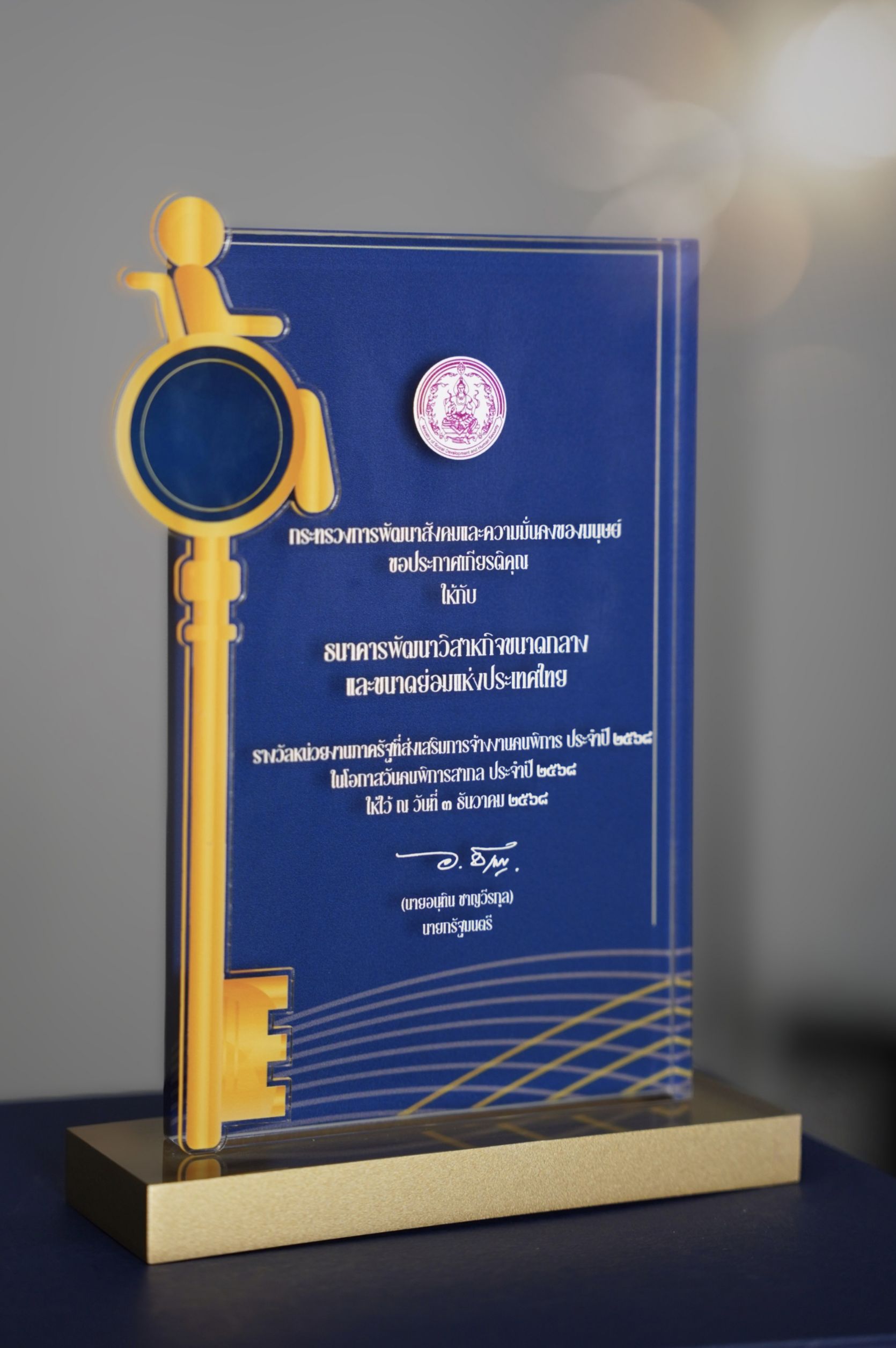 ธนาคารพัฒนาวิสาหกิจขนาดกลางและขนาดย่อมแห่งประเทศไทย (ธพว.) หรือ SME D Bank โดยนายเขมชาติ อภิรัชตานนท์ รองกรรมการผู้จัดการ เป็นตัวแทนรับมอบโล่ประกาศเกียรติคุณ รางวัลหน่วยงานภาครัฐส่งเสริมการจ้างงานคนพิการ ในงานวันคนพิการสากล ประจำปี 2568 จัดโดยกรมส่งเสริมและพัฒนาคุณภาพชีวิตคนพิการ กระทรวงการพัฒนาสังคมและความมั่นคงของมนุษย์ เนื่องจากมีการส่งเสริมสังคมที่ครอบคลุมและเอื้อต่อคนพิการ เพื่อขับเคลื่อนความก้าวหน้าและการพัฒนาทางสังคมอย่างยั่งยืน โดยมีนายอัครา พรหมเผ่า รัฐมนตรีว่าการกระทรวงการพัฒนาสังคมและความมั่นคงของมนุษย์ เป็นประธานในพิธี และนางสาวสนธยา บุณยภูษิต อธิบดีกรมส่งเสริมและพัฒนาคุณภาพชีวิตคนพิการ เป็นผู้มอบรางวัล ณ ห้องรอยัล จูบิลี่ บอลรูม อาคารชาเลนเจอร์ อิมแพ็ค เมืองทองธานี เมื่อวันที่ 3 ธันวาคม 2568 ที่ผ่านมา