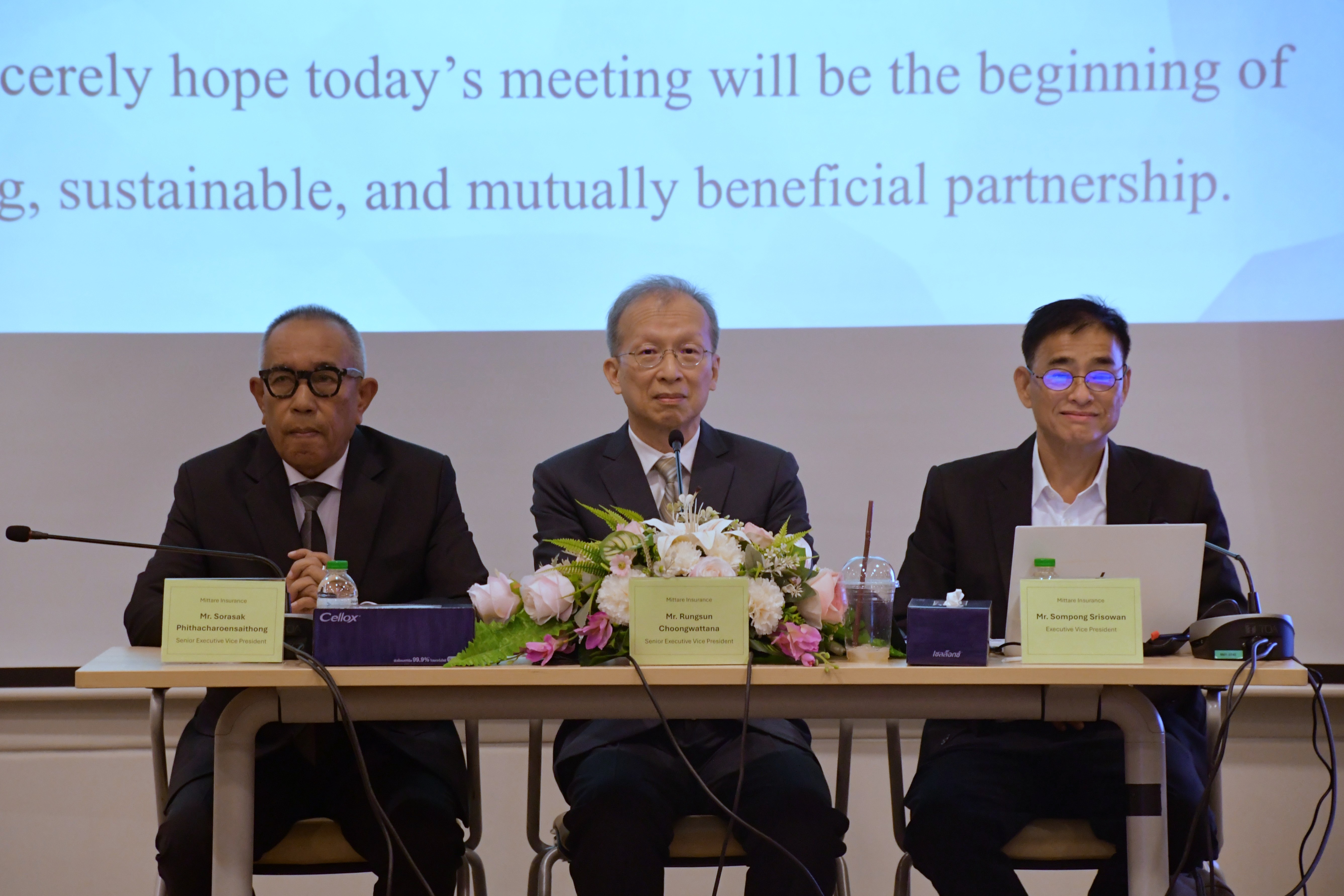 ในโอกาสนี้ นายรังสรรค์ จูงวัฒนา กรรมการบริหารและรองกรรมการผู้จัดการอาวุโส พร้อมด้วย คุณสรภ์ศักย์ ภิธเจริญสายทอง รองกรรมการผู้จัดการอาวุโส ฝ่ายขยายงาน และ คุณสมพงษ์ ศรีโสวรรณ รองกรรมการผู้จัดการ ฝ่ายกิจการตัวแทน และฝ่ายฝึกอบรมและพัฒนาตัวแทน เป็นผู้แทนบริษัทร่วมให้การต้อนรับ พร้อมนำเสนอภาพรวมทิศทางการดำเนินธุรกิจประกันวินาศภัยของมิตรแท้ประกันภัย ทั้งด้านทิศทางเชิงกลยุทธ์ การขยายเครือข่ายตัวแทน การพัฒนาผลิตภัณฑ์ และการนำเทคโนโลยีมาสนับสนุนการให้บริการ เพื่อยกระดับประสบการณ์ของลูกค้าอย่างรอบด้าน