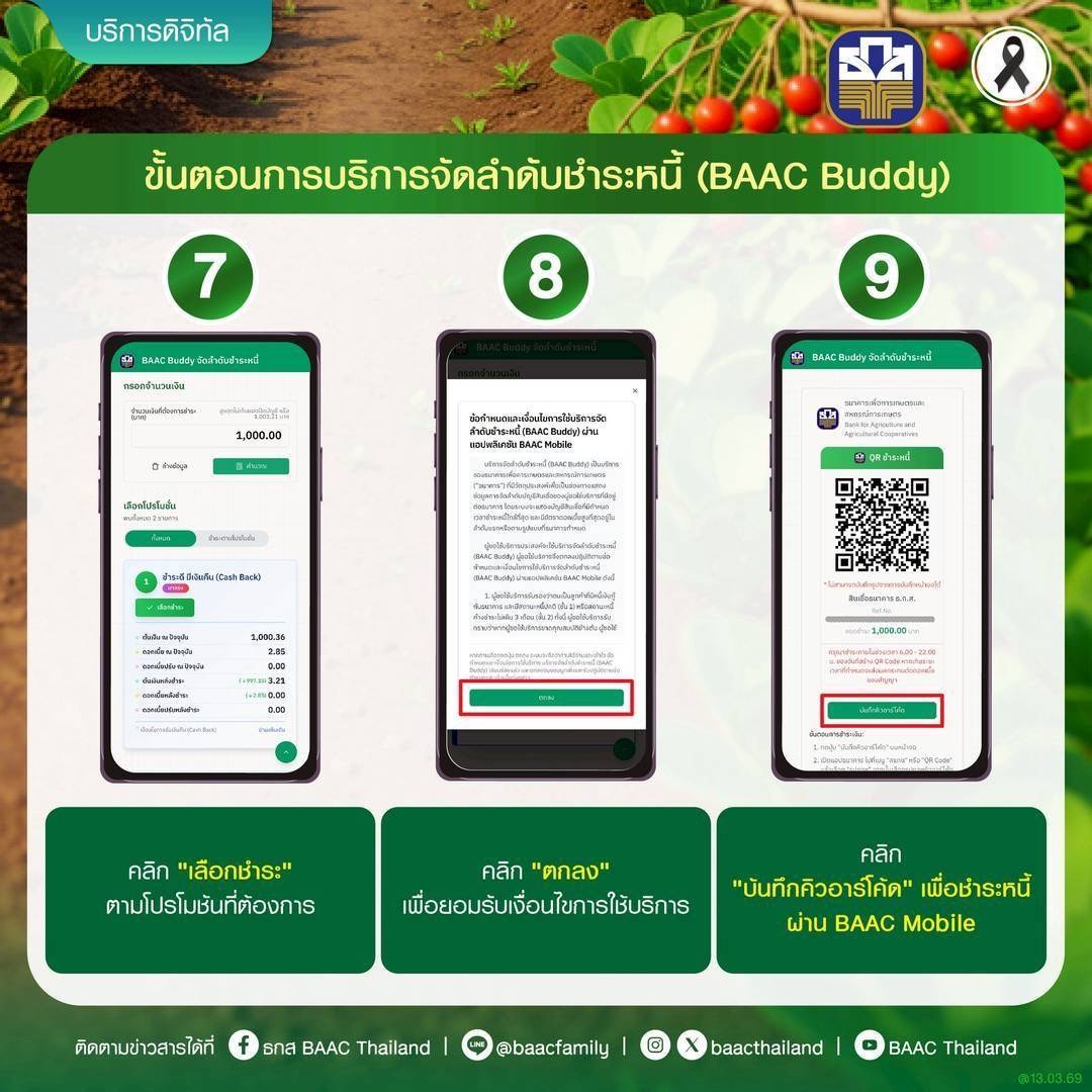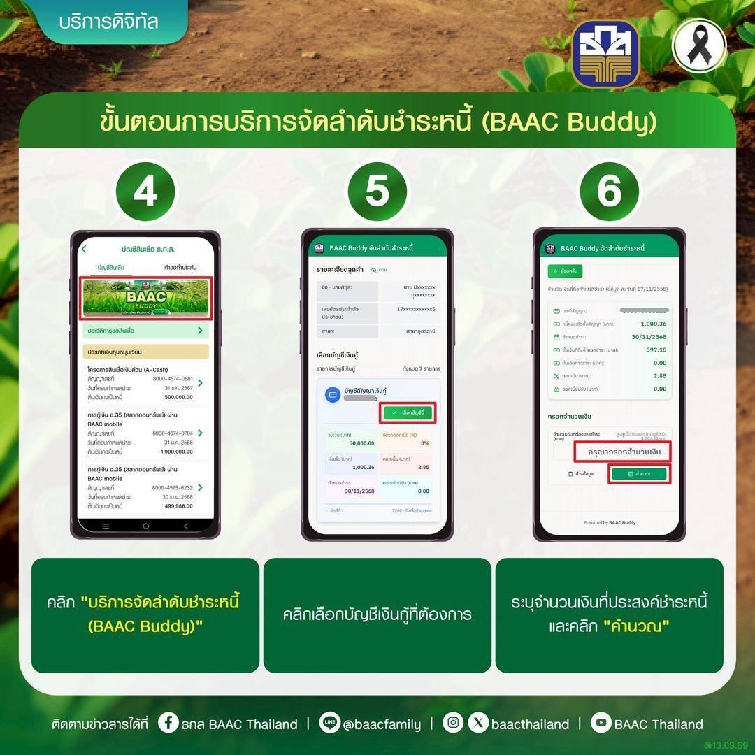 นอกจากนี้ ยังมาพร้อมเครื่องมือวิเคราะห์ ภาระหนี้โดยรวมของผู้ใช้งานแสดงภาพรวมของยอดคงค้าง อัตราดอกเบี้ย และระยะเวลาการชำระหนี้ เพื่อช่วยให้ลูกค้า สามารถตัดสินใจทางการเงินได้แบบมีข้อมูลรองรับ และยังช่วยลดค่าใช้จ่ายการเดินทาง เพราะสามารถชำระหนี้ผ่าน แอปพลิเคชัน BAAC Mobile ได้ทันที ทั้งกรณีชำระปกติ หรือชำระตามโปรโมชันที่ธนาคารกำหนด อาทิ “ชำระดีมีเงินคืน (Cash Back)” ภายใต้โครงการ ชำระดีมีโชค (สิ้นสุด 31 มีนาคม 2569) และแคมเปญ “BAAC Buddy จ่ายดี มีวินัยได้เงิน” (สิ้นสุด 30 เมษายน 2569) เป็นต้น